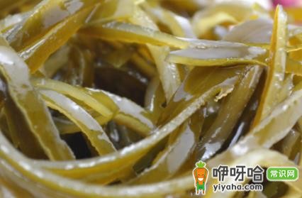 海带中除了碘含量高外,还含有甘露醇,是一种附着在海带表面的白色粉末。 海带加工后应干净整洁、无霉变、不粘手。 如果清洗海带后的水有不同的颜色,则应停止食用。