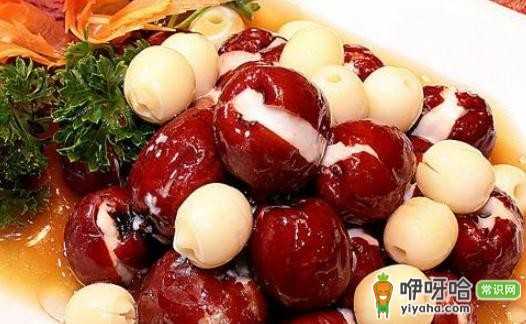 中医认为红枣性暖,养血保血,可改善血液循环,而药理研究则发现,红枣所含的某些成分可以增加血液中红血球的含量,增强骨髓造向功能,使脸色红润。和桂圆搭配,不但补血养气,还可以养颜美容。